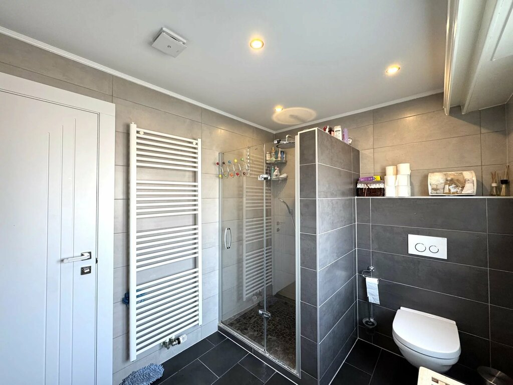 Au premier étage, vous trouverez un palier, une salle de bains, une cuisine équipée ouverte sur la salle à manger et le living avec cheminée et sortie sur la terrasse couverte et l'abri de jardin transformé en sauna.